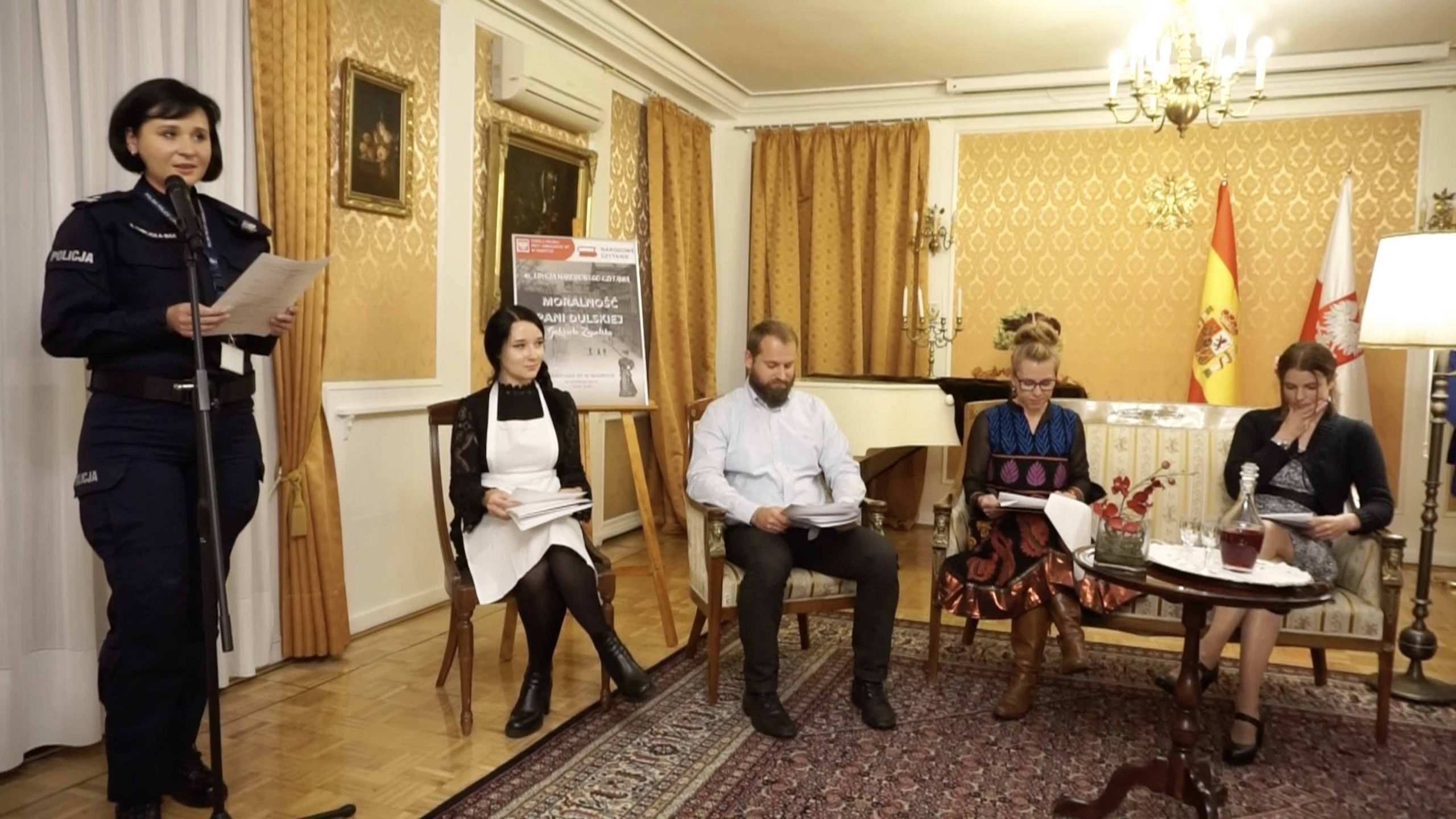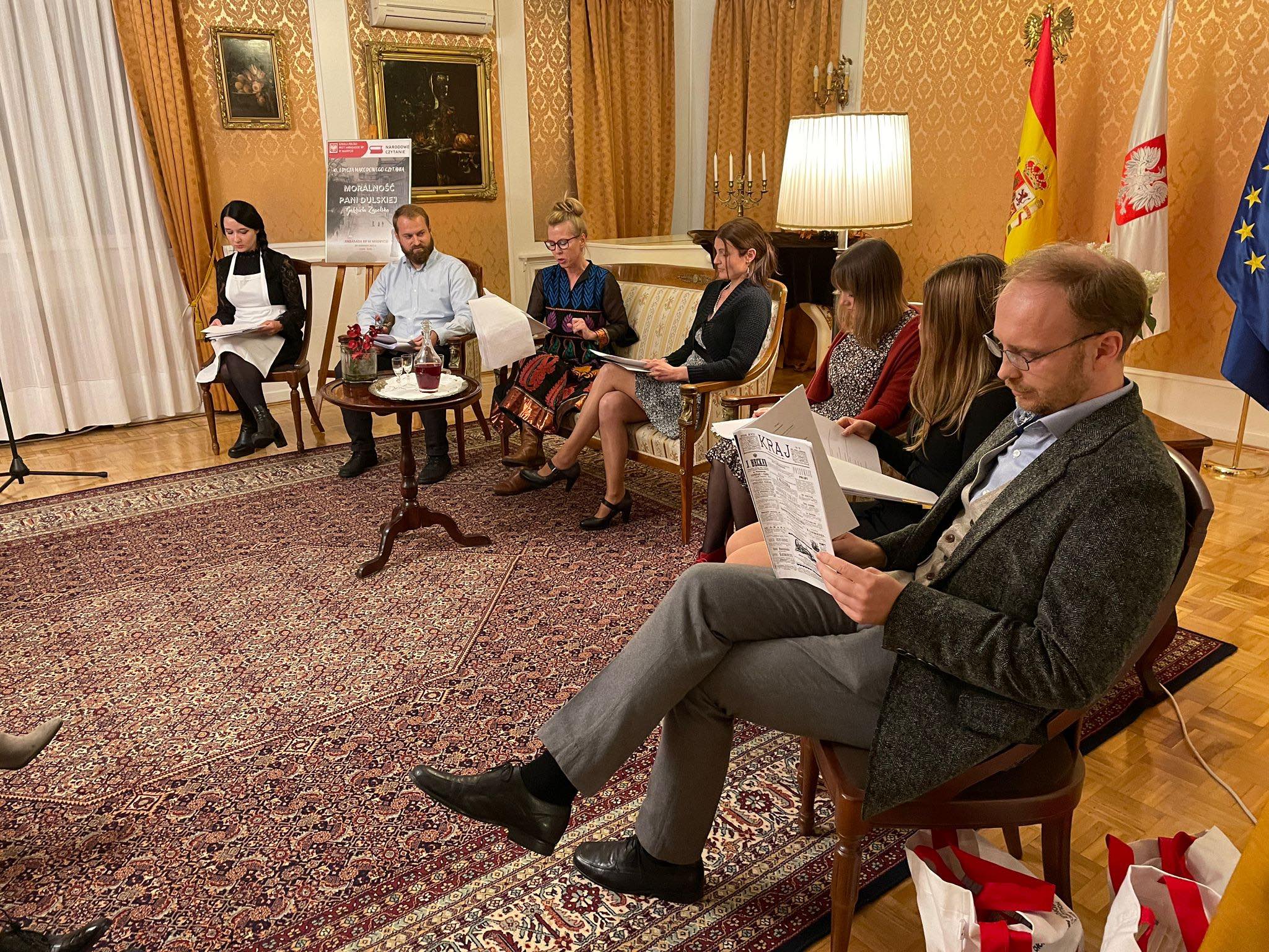 Spotkanie poprowadziła para licealistów – Kinga Kozłowska oraz Jan Wąsowicz. Fragmenty scen ,,Moralności Pani Dulskiej” czytali: Chargée d’affaires Karina Węgrzynowska (Pani Dulska), konsul Justyna Tokarska (Lokatorka), radca Ambasady Karolina Gawlicka-Bąk (Didascalia, akt II)), wicedyrektor Instytutu Polskiego Gabriela Słowińska (Juliasiewiczowa), kierownik Szkoły Polskiej Małgorzata Małaśnicka (Pani Dulska),Agata Zapłotna – lektorka języka polskiego na Uniwersytecie Complutense (Hanka), Małgorzata Kierzkowska – prezes Stowarzyszenia Orzeł Biały(Tadrachowa), Anna Papla-Cardenal ze Stowarzyszenia Klub Wawel (Pani Dulska), Anna Bogusz ze Stowarzyszenia im. Karola Wojtyły w Segowii (Juliasiewiczowa), Beata Stępień ze Stowarzyszenia Pegaz (Pani Dulska), Artur Jarząbek – Stowarzyszenie Polish Professionals in Madrid (Zbyszko), Ernest Kowalczyk, nauczyciel w Szkole Polskiej przy Ambasadzie RP w Madrycie (Pan Dulski), uczniowie: Kamila Mazur (Mela), Wiktoria Bereś (Hesia), Dawid Kiełbiowski (Zbyszko) oraz Jakub Gross (Didascalia, akt I i III).