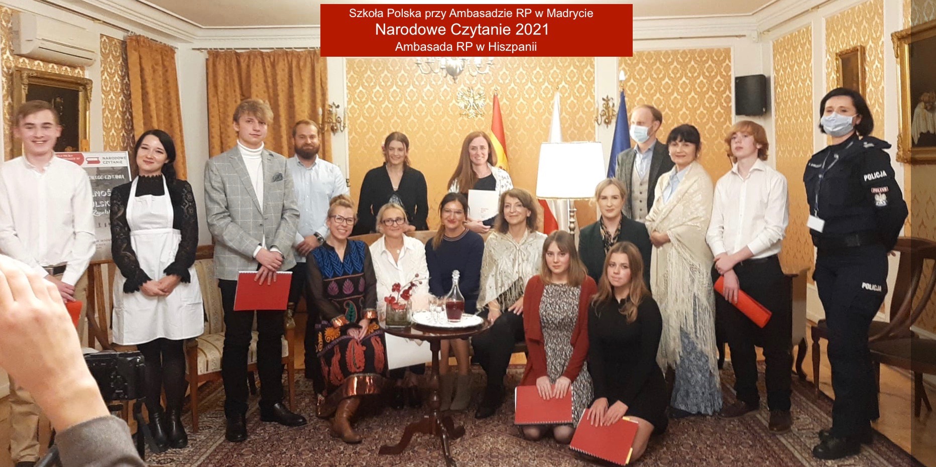 Szkoła Polska przy Ambasadzie RP w Madrycie organizuje od wielu lat akcję Polonijnego Narodowego Czytania do udziału w którym zaprasza przedstawicieli Ambasady, Instytutu Polskiego, madryckiej slawistyki, organizacji i środowisk polonijnych oraz społeczności szkolnej. W tym roku, dzięki współpracy Szkoły z Ambasadą RP w Hiszpanii, madryckie Czytanie odbyło się – jak na X jubileuszową edycję przystało – w pięknej scenerii salonów Ambasady, w sobotę 20 listopada.