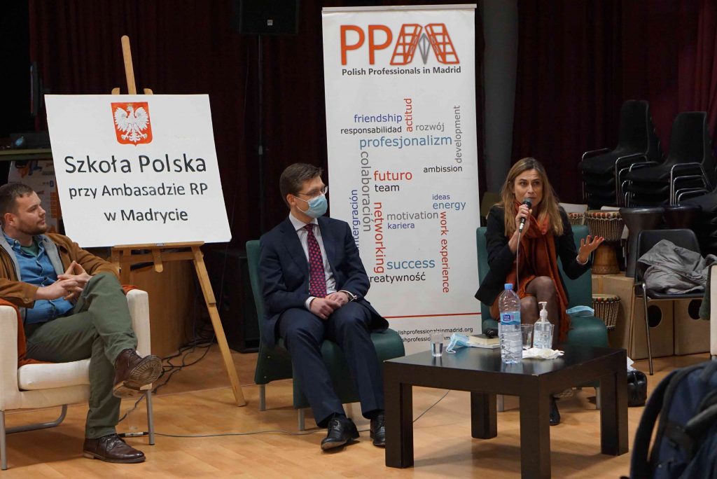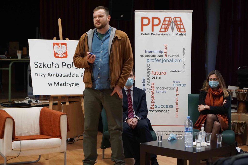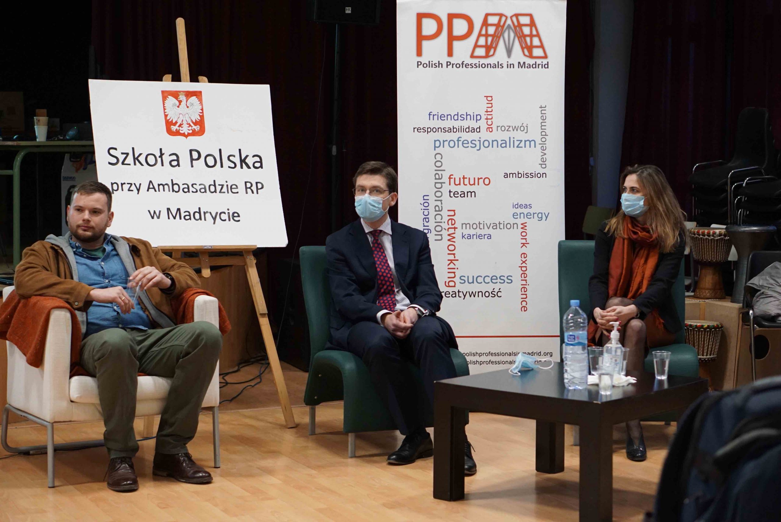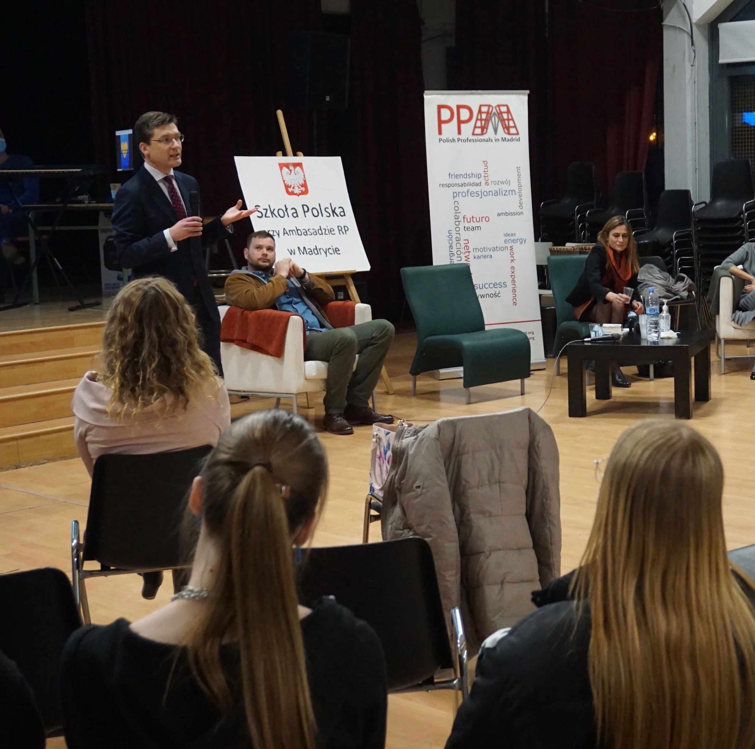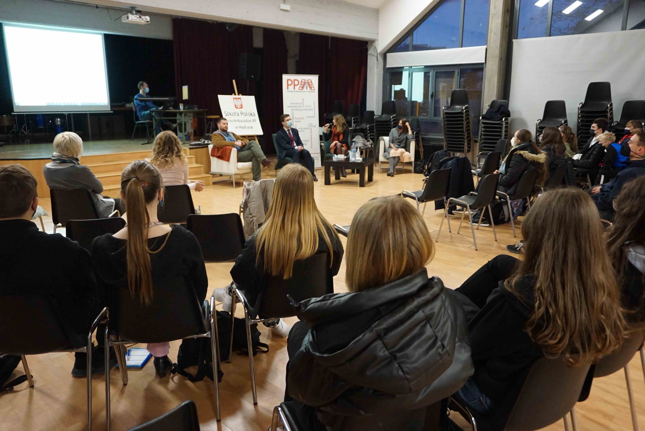 W ramach cyklu ,,Spotkania z ciekawymi Polakami” gościliśmy w naszej Szkole bardzo interesujące osoby – mentorów z nowatorskiego programu ,,Mój Mentor” Stowarzyszenia Polish Professionals in Madrid. Towarzyszyła im Prezes Stowarzyszenia pani Patrycja Sałacińska-Kone oraz koordynatorka programu pani Emilia Pallado. W spotkaniu z naszymi licealistami uczestniczyli: pani Agata Miłosz, menedżerka zmian biznesowych, dr Miquel Bordas Prószyński z kancelarii prawniczej, pan Krzysztof Leśniak – menedżer pracujący w wielkiej firmie IT oraz pani Joanna Bardzińska – tłumaczka i zarazem kurator przeglądów filmowych z Fundacji Ava Arts. Zaproszeni goście w sposób niezwykle zajmujący i bezpośredni opowiedzieli o swoich studiach, karierze i rozwoju zawodowym oraz aktualnej pracy. Odpowiedzieli też na liczne pytanie młodzieży. Program mentoringowy oferuje młodzieży pochodzenia polskiego w Hiszpanii wsparcie przy wyborze kierunku studiów oraz kariery zawodowej.