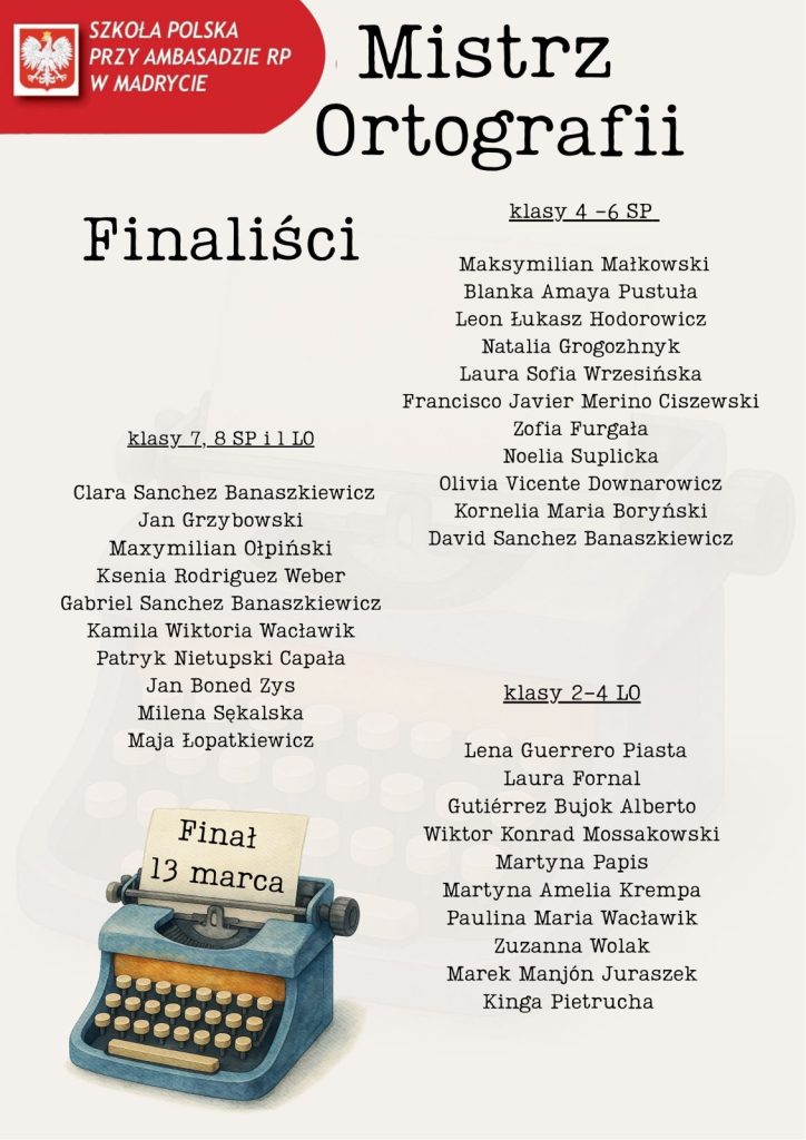 Miło nam przedstawić listę finalistów Szkolnego Konkursu Ortograficznego „Mistrz Ortografii”. Pamiętajcie, finał już 13 marca!