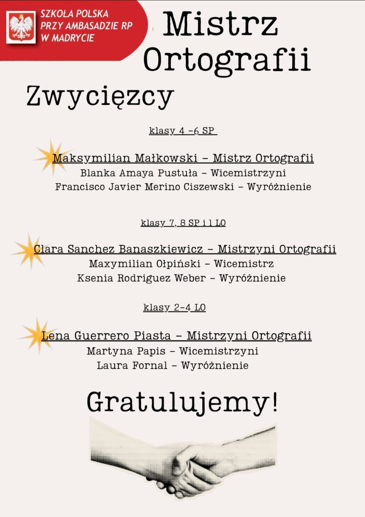 Z wielką przyjemnością publikujemy wyniki Szkolnego Konkursu Ortograficznego. Polska pisownia, pełna pułapek i wyjątków, potrafi być wyzwaniem nawet dla mistrzów, dlatego tym bardziej podziwiamy Waszą wiedzę i czujność. Serdecznie gratulujemy laureatom! Wręczenie nagród ufundowanych przez Radę Rodziców nastąpi 10 kwietnia.